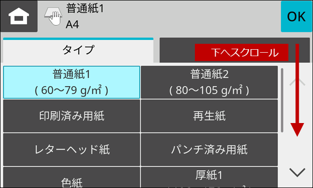 3.「用紙タイプ」の画面が表示されますので、画面を下へスクロールします。