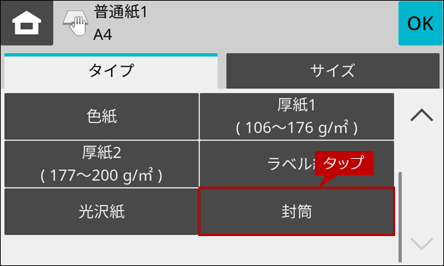 2. 封筒をセットしますとホーム画面に「手差しトレイ」の自動検知画面が表示されますので[タイプ]をタップします。