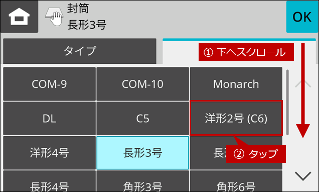 6.「用紙サイズ」の画面が表示されますので、画面を下へスクロールして、[洋形2号(C6)]をタップします。