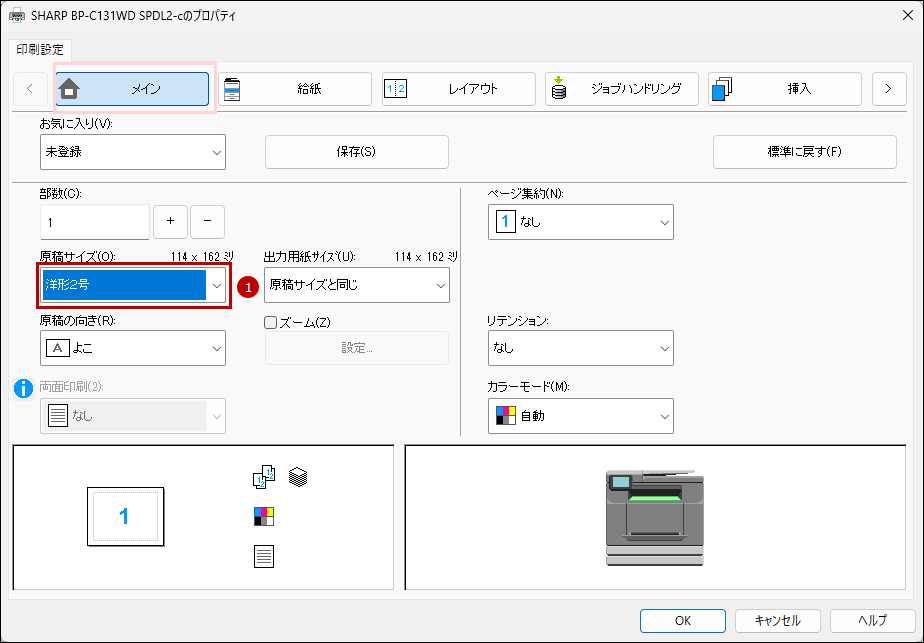 10.「プリンタードライバー」の設定画面で[メイン]タブを選択して、原稿サイズ(O)を設定します。
