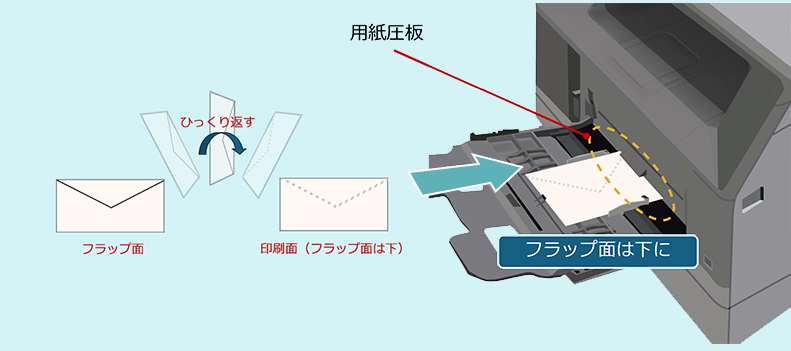 | 表裏の向き:印刷面を上にする(フラップ面は下になります) 上下の向き:端部が給紙フィーダーにあたるようセットする ※ 封筒のフラップ(封入口)は閉じたままにしておく 最大セット枚数:10枚まで | |