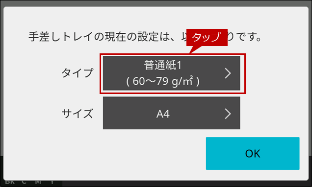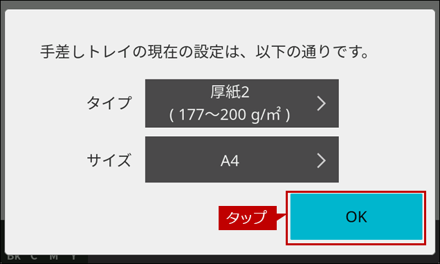 2. 厚紙をセットしますとホーム画面に「手差しトレイ」の検知画面が表示されますので、「用紙タイプ」をタップします。