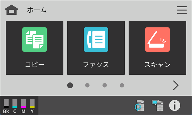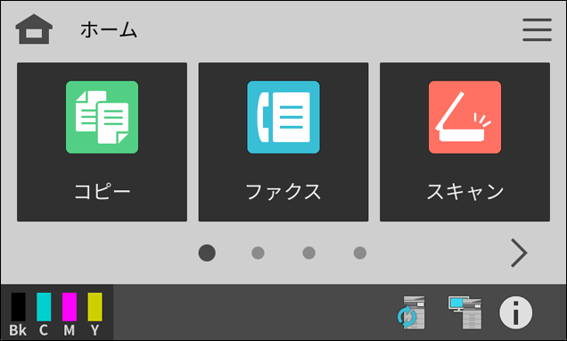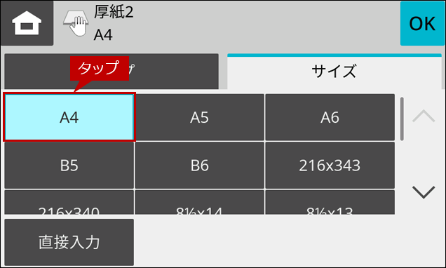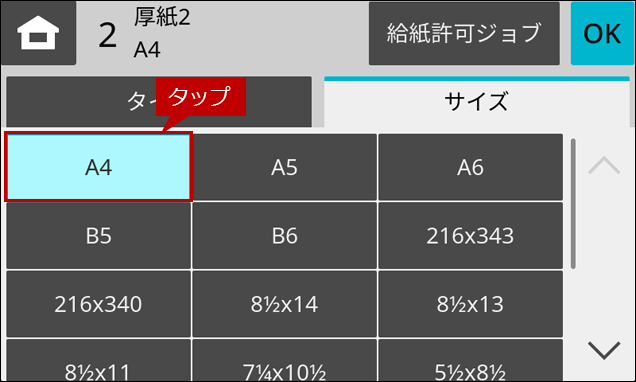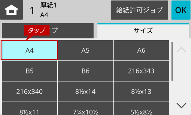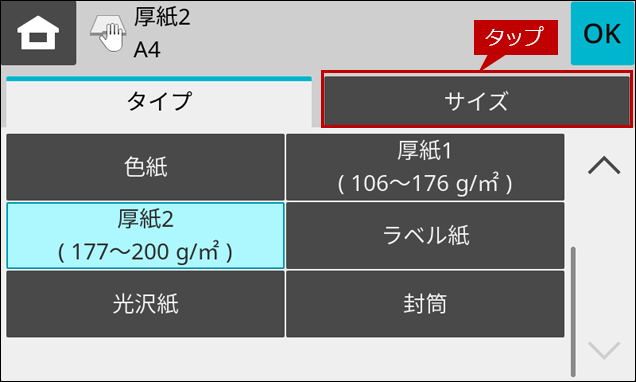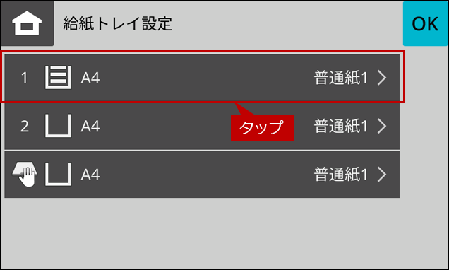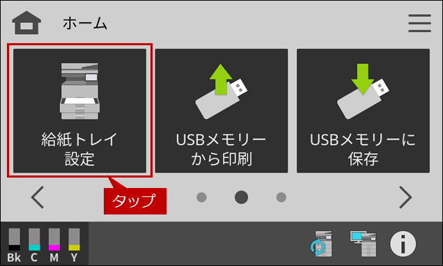 ※ [給紙トレイ設定]ボタンがトップページにない場合は、ホーム画面を右にスクロールします。