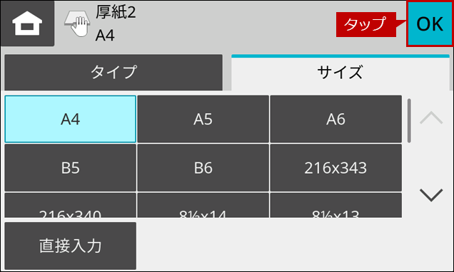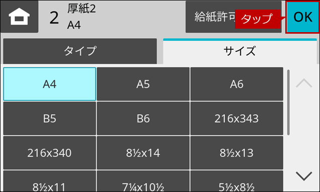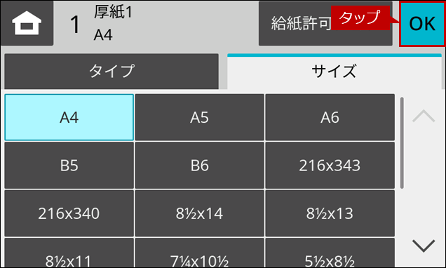 9.「給紙トレイ設定]画面にもどりますので、用紙サイズと用紙タイプを確認し、[OK]をタップします。