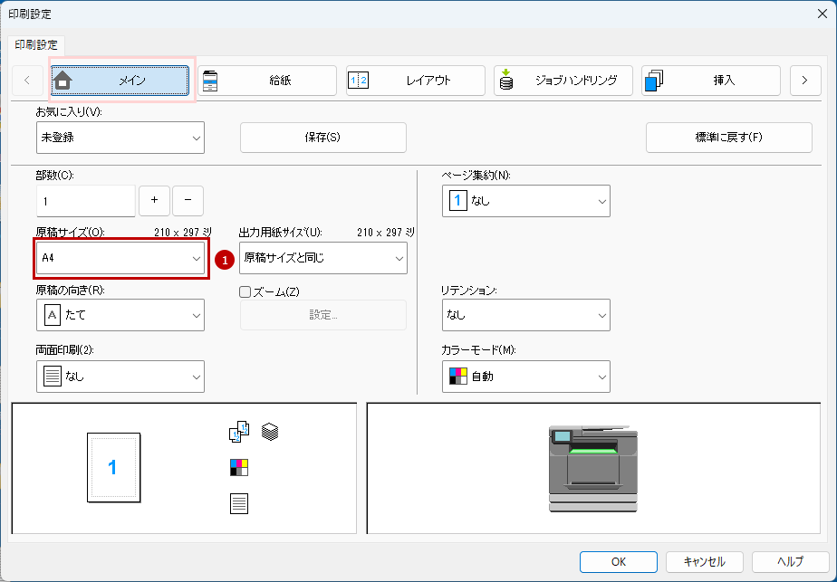 10.「プリンタードライバー」の設定画面で[メイン]タブを選択して、原稿サイズ(O)を設定します。