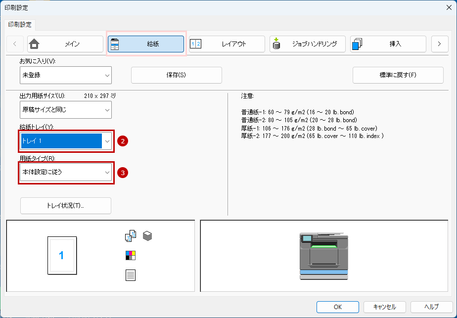 12. 次にプリンタードライバー設定画面で [給紙]タブをクリックし、給紙トレイと用紙タイプを設定します。