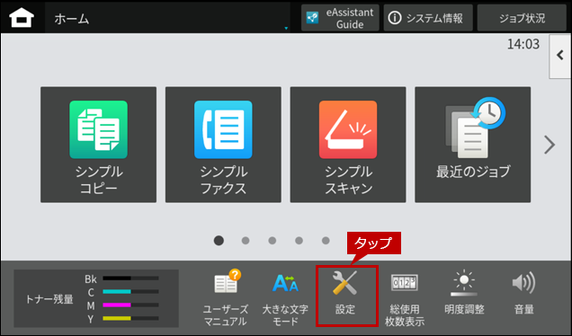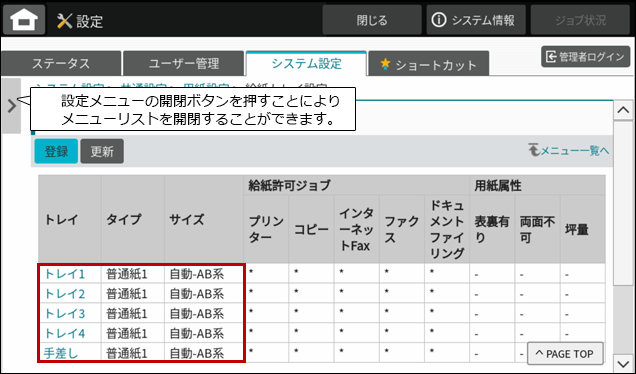給紙トレイの用紙タイプや用紙サイズの設定は、設定画面にある[給紙トレイ設定]から変更できます。