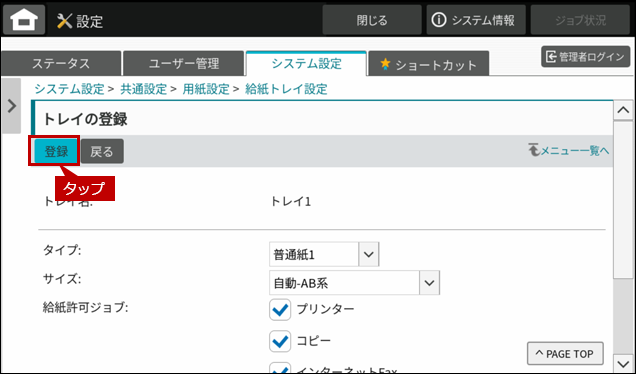 例)トレイ1、トレイ2、トレイ3、トレイ4の登録画面(例:トレイ1の設定画面)
