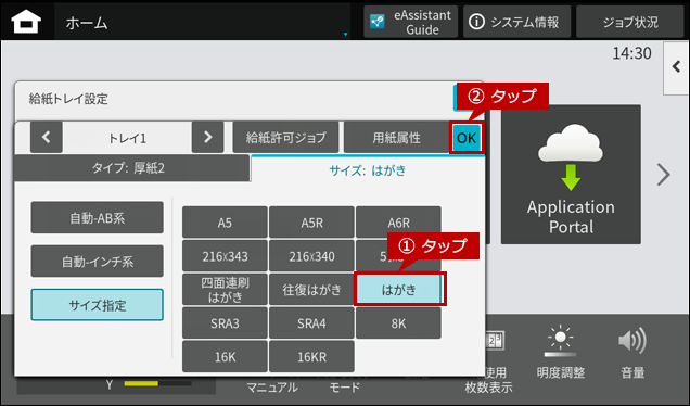 2. はがきをセットしますとホーム画面に「手差しトレイ」の自動検知画面が表示されますので、「用紙タイプ」と「用紙サイズ」を確認して、[OK]をタップします。