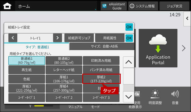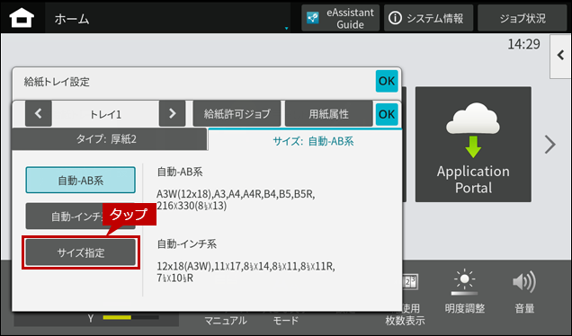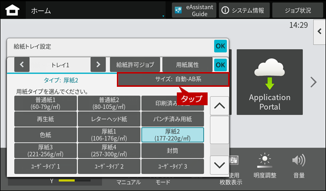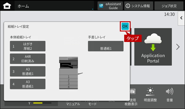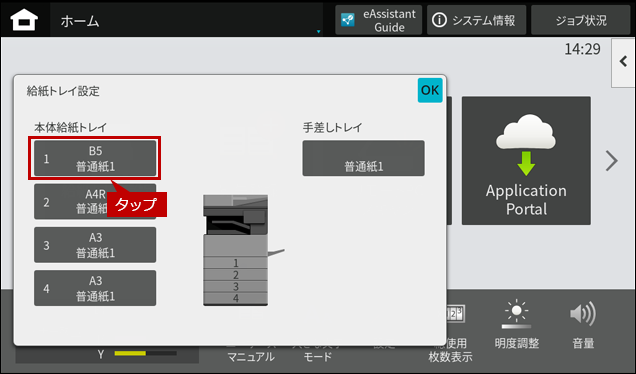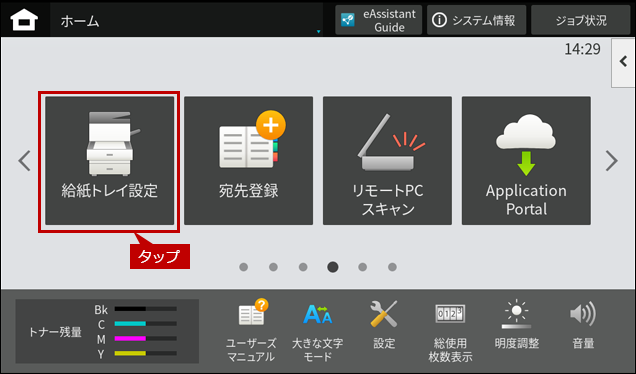 ※ [給紙トレイ設定]ボタンがトップページにない場合は、ホーム画面を右にスクロールします。
