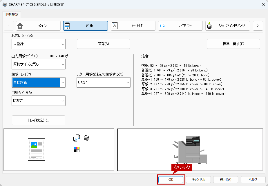 12. プリンタードライバー設定画面で[OK]をクリックして、印刷を実行します。
