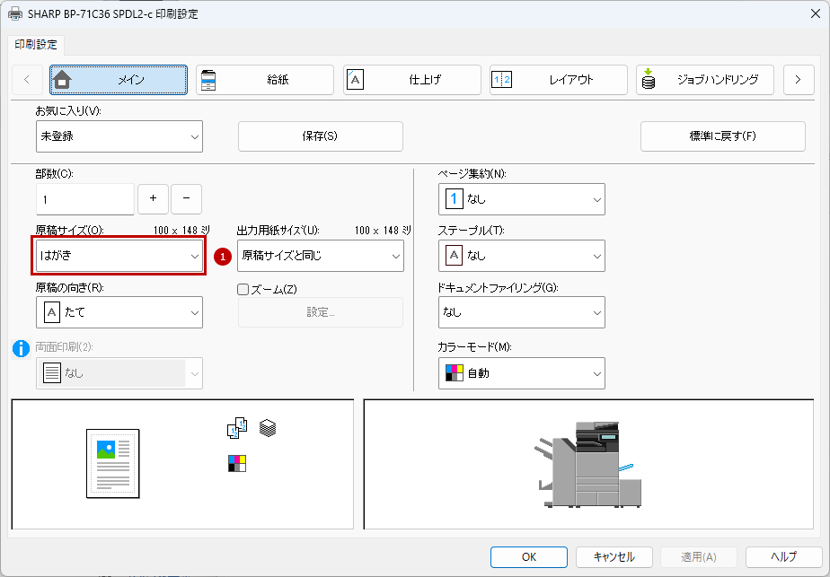 4.「プリンタードライバー」の設定画面で[メイン]タブを選択して、原稿サイズ(O)を「はがき」に設定します。