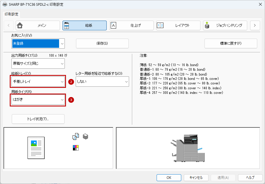 5. 次にプリンタードライバー設定画面で[給紙]タブをクリックし、給紙トレイと用紙タイプを設定します。