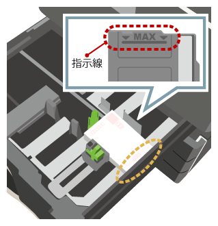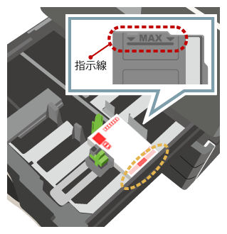 | 表裏の向き:印刷面を上にする 上下の向き:はがきの下部が右側(外側)になるようセットする 最大セット枚数:100枚以内で、指示線の高さまで | |