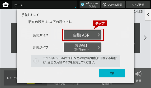 5.「手差しトレイ」の自動検知画面にもどりますので、用紙サイズが変更されていることを確認して、[OK]をタップします。