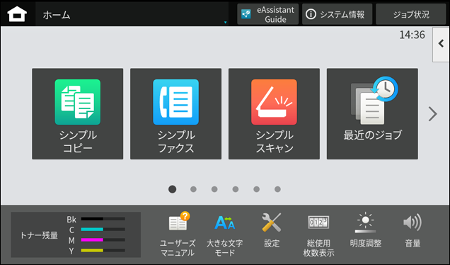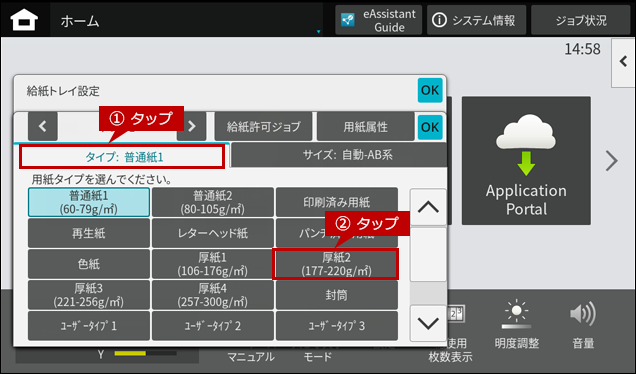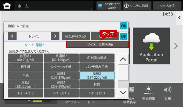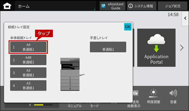 ※ [給紙トレイ設定]ボタンがトップページにない場合は、ホーム画面を右にスクロールします。