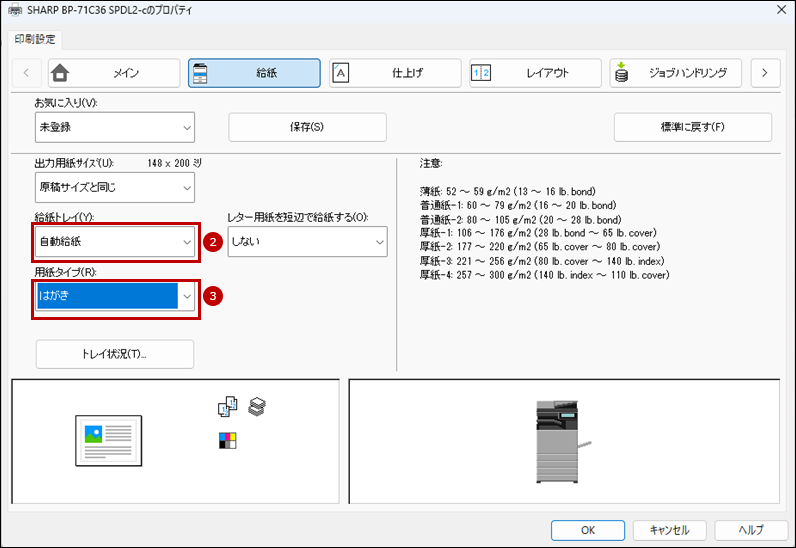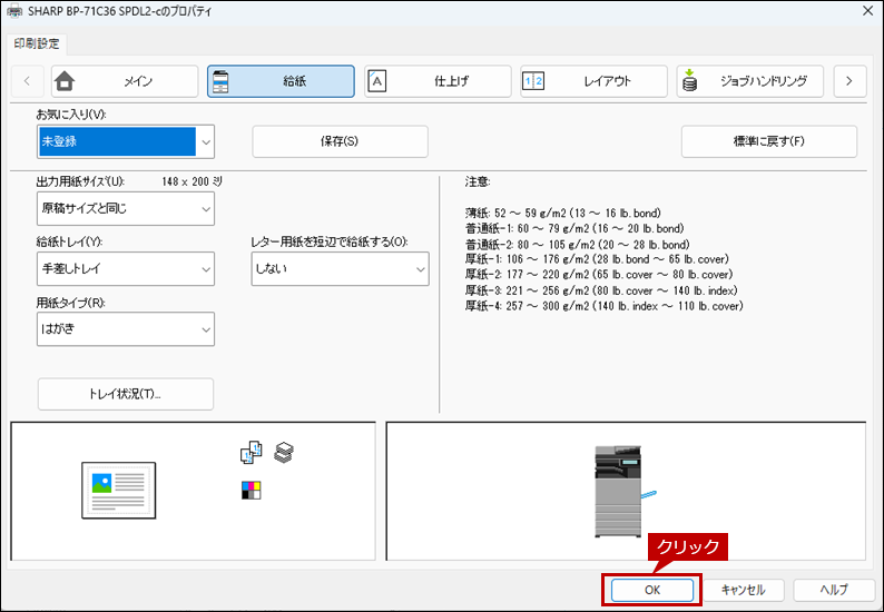 11. 次にプリンタードライバー設定画面で[給紙]タブをクリックし、給紙トレイと用紙タイプを設定します。
