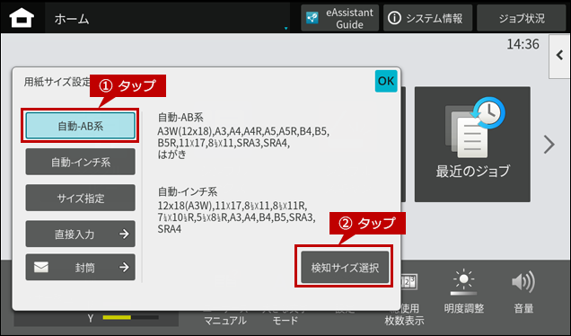3.「サイズ設定」画面が表示されますので、[自動-AB系]をタップして、[検知サイズ選択]をタップします。