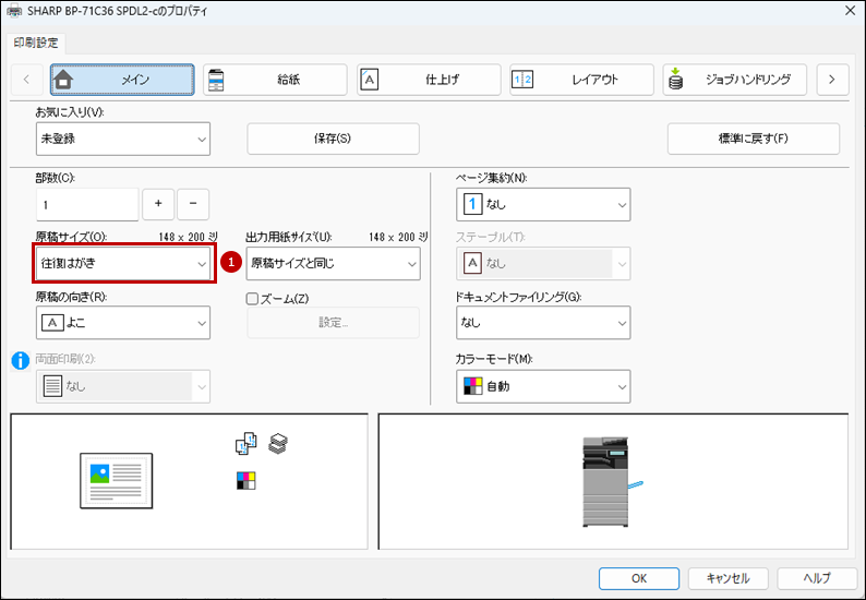 7.「プリンタードライバー」の設定画面で[メイン]タブを選択して、原稿サイズ(O)を「往復はがき」に設定します。