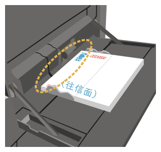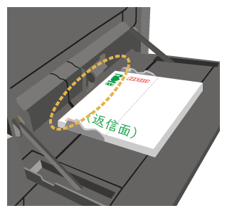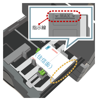 | 表裏の向き:印刷面を上にする 上下の向き:印刷面の文面側が右側(外側)になるようセットする 最大セット枚数:100枚以内で、指示線の高さまで | |
