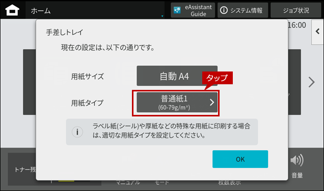 2. ホーム画面に「手差しトレイ」の自動検知画面が表示されますので、「用紙タイプ」をタップします。