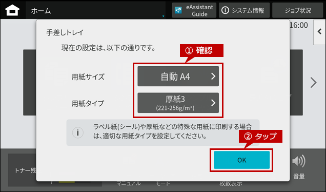 4.「手差しトレイ」の自動検知画面に戻りますので、「用紙タイプ」と「用紙サイズ」を確認して、[OK]をタップします。