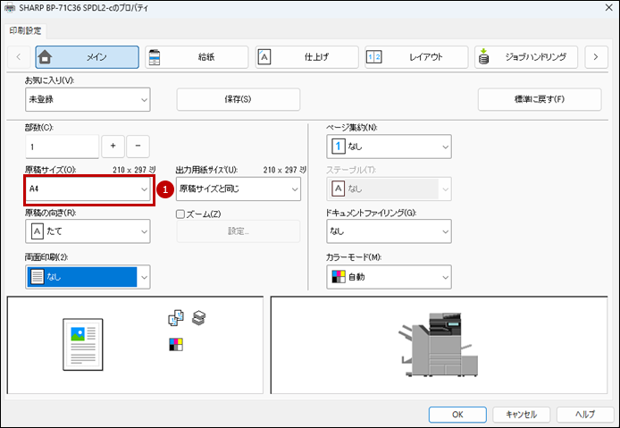 6.「プリンタードライバー」の設定画面で[メイン]タブを選択して、原稿サイズ(O)を設定します。
