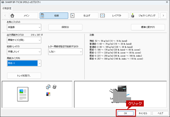 7. 次にプリンタードライバー設定画面で[給紙]タブをクリックし、給紙トレイと用紙タイプを設定します。