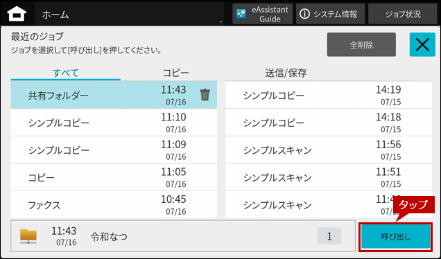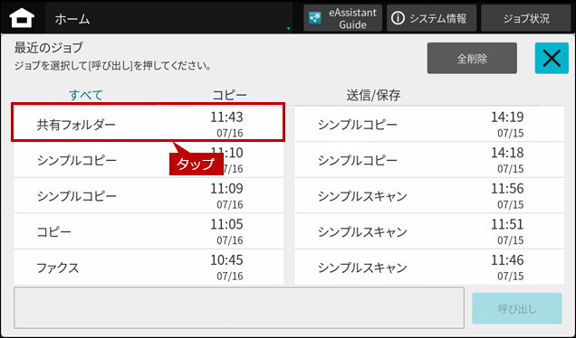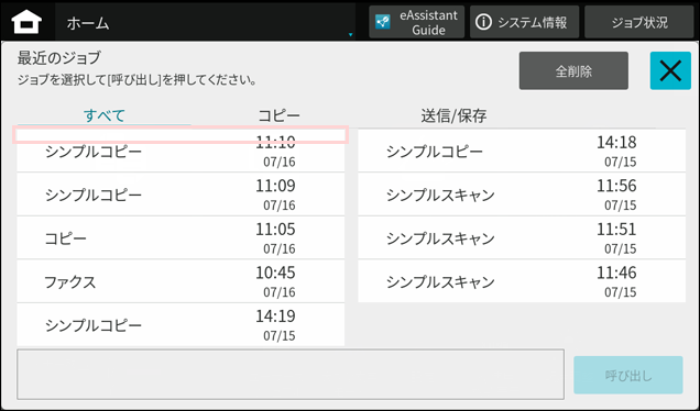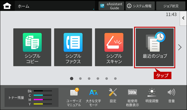 ホーム画面で[最近のジョブ]をタップすると、最近使用したジョブ履歴が表示されます。もう一度使用したいジョブをタップして操作を実施してください。