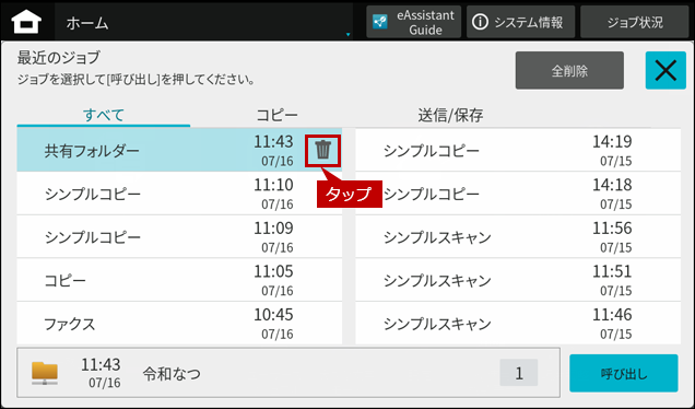 2. 「最近のジョブ」画面が表示されますので、削除したいジョブをタップします。