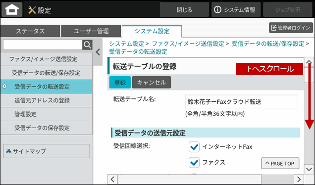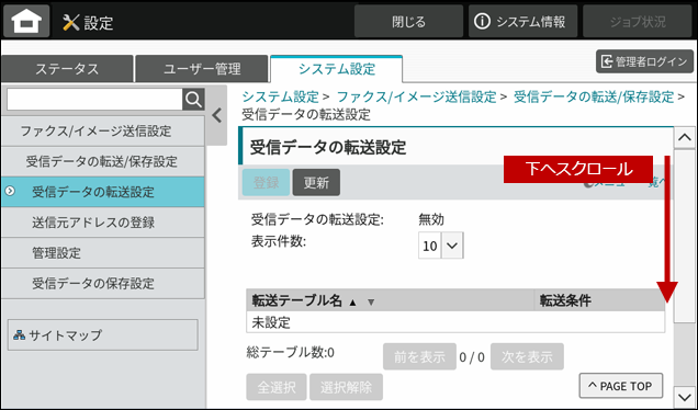 10. 「転送テーブルの登録」画面が表示されますので、ページを下にスクロールします。