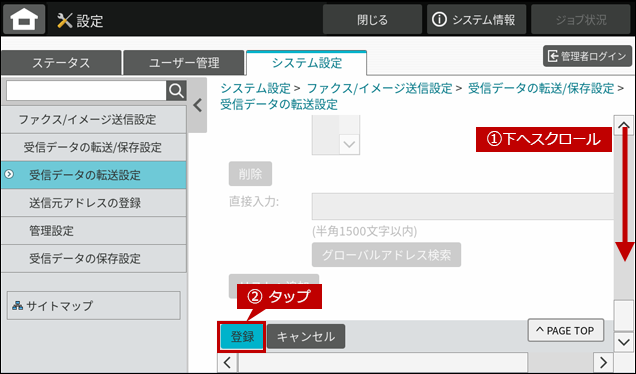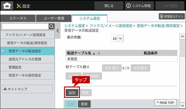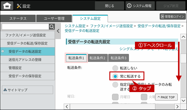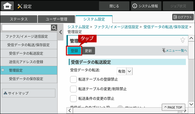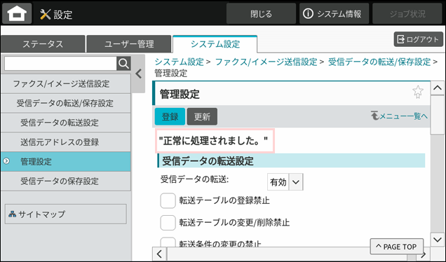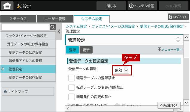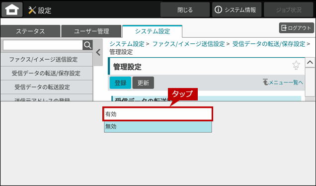 - ●受信データの転送設定を「有効」にするには、管理者パスワードでログインする必要があります。