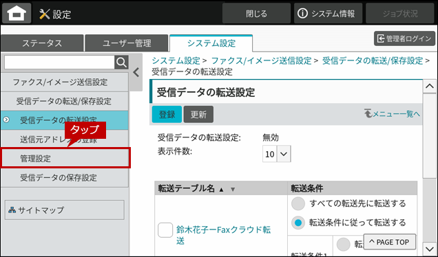 16.「管理設定」画面が表示されますので、[受信データの転送]をタップします。