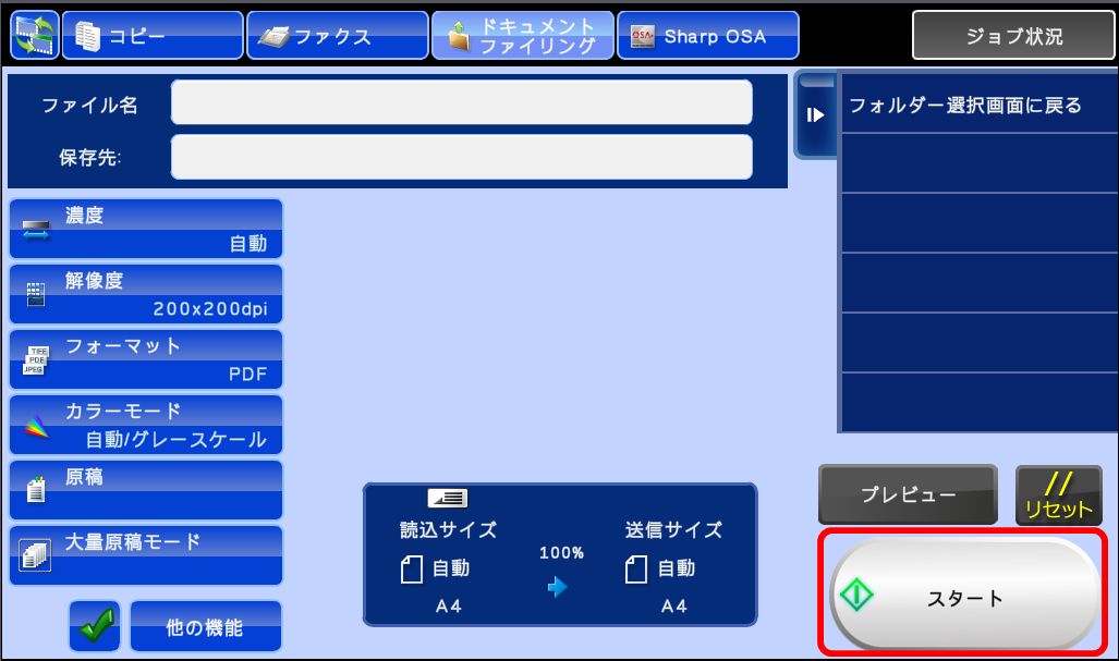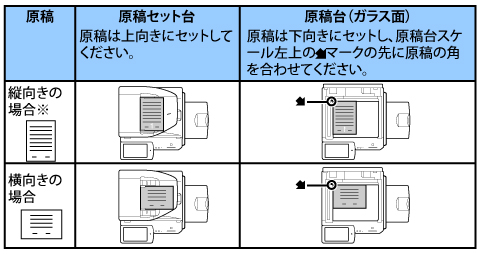 ④原稿を原稿自動送り装置の原稿セット台、または原稿台(ガラス面)にセットします。