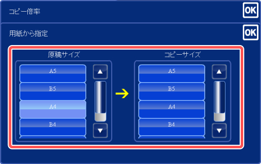 設定した倍率に応じた用紙サイズが選択されていることを確認します。