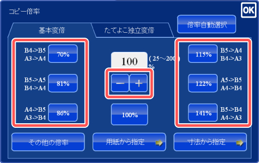 決まった用紙サイズに拡大や縮小してコピーしたい場合、「倍率自動選択」を使用すると便利です。操作ステップ