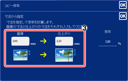 画像サイズ、仕上がりサイズそれぞれのサイズ表示部をタップして、数字キー(10キー)でサイズを入力します。設定が終わったらを[OK]キータップします。