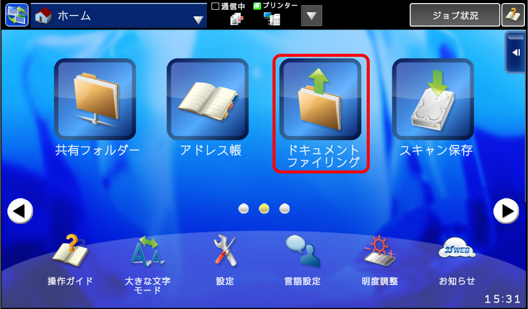 ①ホーム画面の[ドキュメントファイリング]アイコンをタップします。