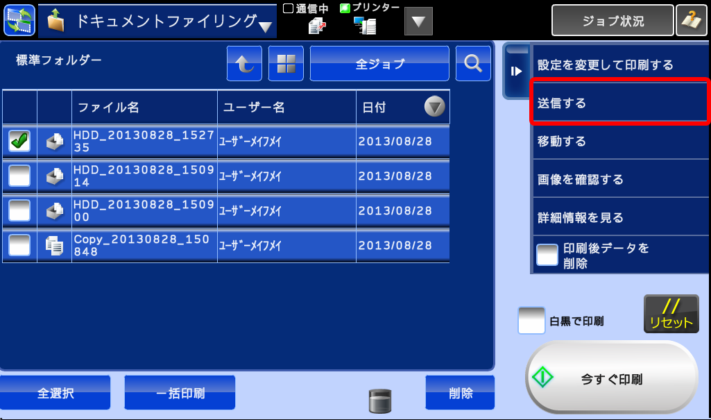 「複合機」内に保存されたデータを再送信するには、保存先のフォルダーからファイルを指定し、通常の送信と同様の操作を行います。操作ステップ