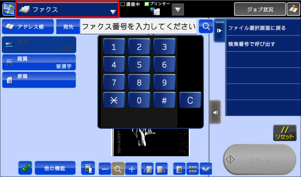 画面左上の[ファクス]と表示されいてる部分をタッチします。