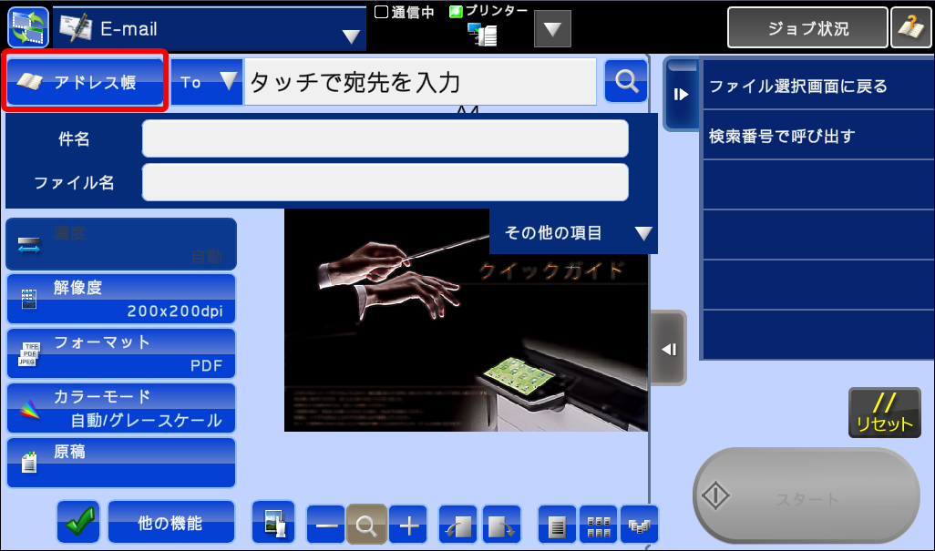 ⑧E-Mailの画面が表示されたら、[アドレス帳] ボタンをタッチします。