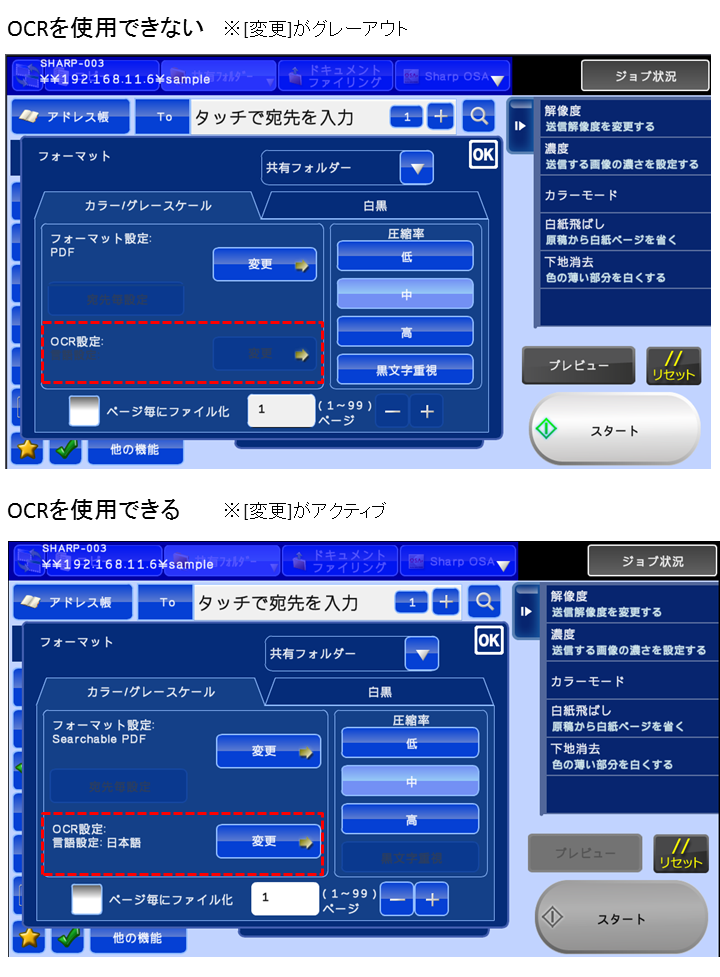 文書認識(OCR)機能は、ホーム画面で「FTP/Desktop」、「E-mail」、「共有フォルダー」、「ドキュメントファイリング(外部メモリーデバイスにスキャン保存する)」のいずれかの機能を選択した場合に表示される「フォーマット」画面で、「OCR設定」の[変更]ボタンがアクティブになるフォーマットを選択した場合に設定できます。