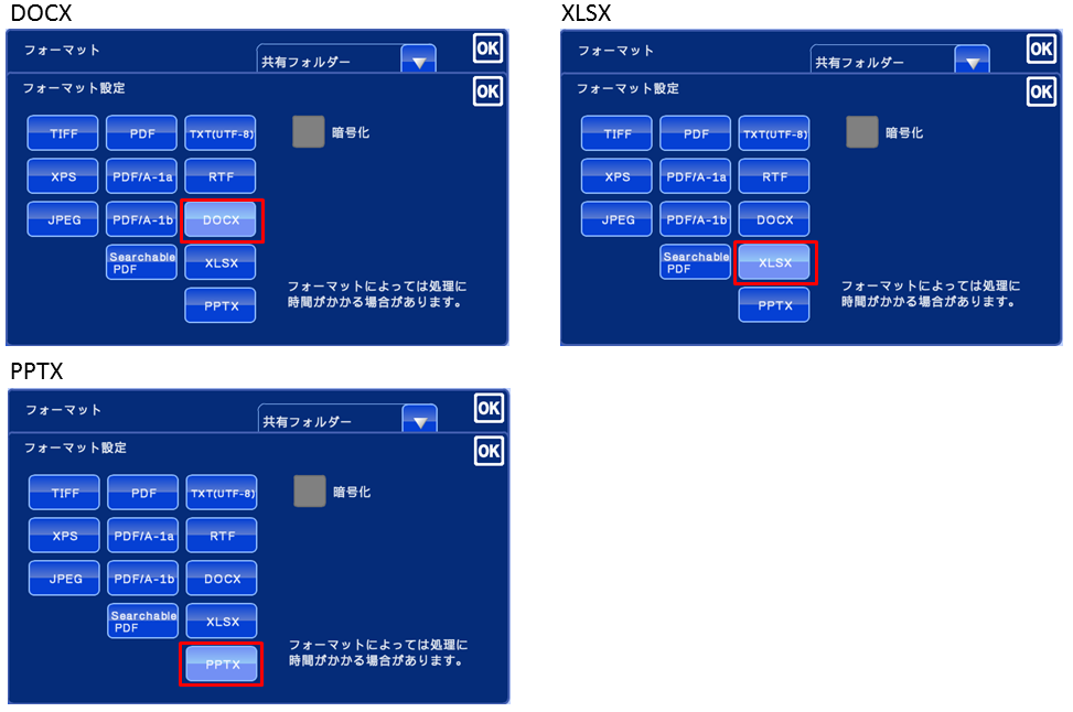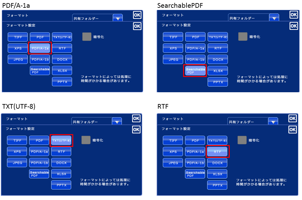 文書認識(OCR)機能が利用できるフォーマット(保存形式)は、次のとおりです。