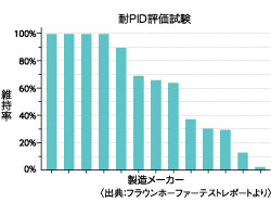 PID現象とは、高温高湿及び高いシステム電圧の影響で、太陽電池モジュールの電気出力低下が起こる現象です。耐PID評価試験では、この状態を擬似的につくりだし太陽電池の出力を評価します。 シャープはPID対策を実施しており、順次評価基準を見直しています。フラウンホーファー(欧州最大の研究機関)が、当社モジュールND-R250A5を評価試験した結果、この現象が起こらないことが2012年6月に報告されました(出力低下していない4社の中の1社がシャープ。右記グラフ参照)。当社は現在、この試験基準より厳しい社内基準を設けて、全機種を評価試験しており、品質を保持しています。
