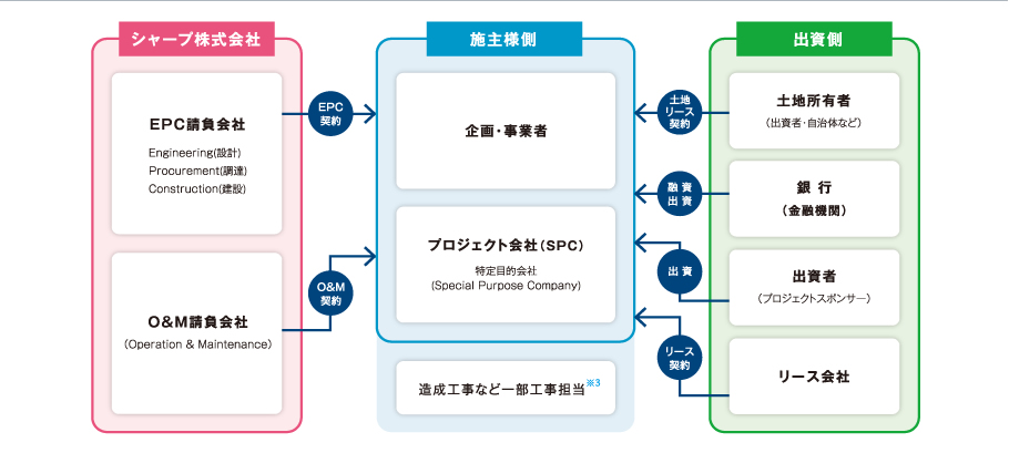設計、機器調達および建設を一括して行う「EPC※1」、発電所の運転・保守を行う「O&M※2」まで。シャープは豊富なノウハウと確かな技術に基づく、メガソーラーソリューションをご提供。お客様の多彩なプロジェクトスキームに対応した、ソーラー事業をお手伝いします。