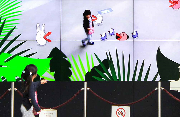 人の動きに反応するキャラクターと画面上で遊べるコンテンツ「ハチエモンランド」は、キャラクターを蹴飛ばしたり、手で叩いたりすると面白い動きをするので子どもたちに大人気で、土日には30~40人が集まるほどです。大人の方も通りすがりに楽しまれることが多く、アトリウムが視聴者と当局をつなぐ楽しい空間になりました。