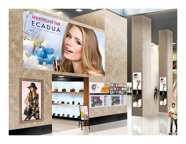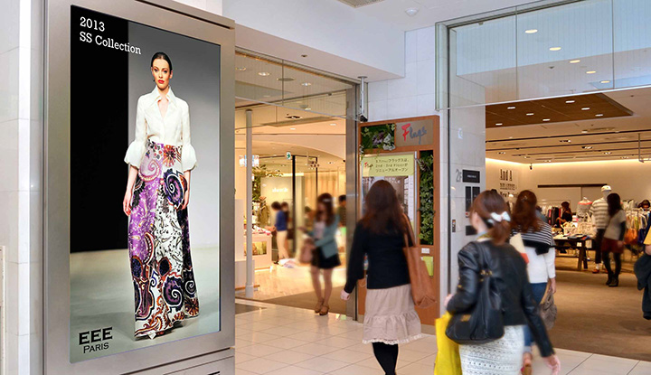 例えば、頭から足元まで等身大で映しだせる大画面はインパクトがあり、魅力的なビジュアルプレゼンテーションが実現でき、アパレルのテナントが数多く含まれる施設では効果的な集客効果が期待できます。四季やクリスマスなどの季節感に合わせた運用も可能です。
