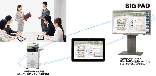 当社製デジタル複合機でスキャンした資料や写真を、「BIG PAD」に転送し、大画面に表示。書き込みした会議資料を各自のタブレット端末に取り込むことができるので、意思の疎通がスムーズに図れます。