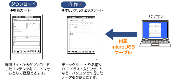 電子ノートとパソコンを付属のmicroUSBケーブルで接続し、画像データ※1や追加フォーム※2を電子ノートに取り込むことができます。