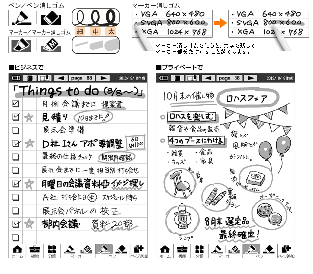 ペンとマーカーは「太」「中」「細」の3つの太さが使用できます。種類や太さを変えて内容を強調したり書き分けるなど、表現力の高いノートを作成できます。また、ペンとマーカーでそれぞれ書き込んだ内容を別々に消せる、便利な専用消しゴムをご用意しています。